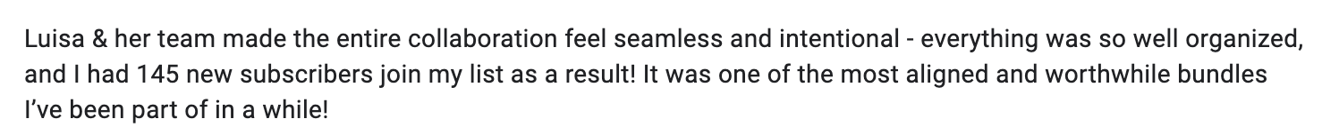 Luisa & her team made the entire collaboration feel seamless and intentional - everything was so well organised, and I had 145 new subscribers join my list as a result! It was one of the most aligned and worthwhile bundles I've been part of in a while!